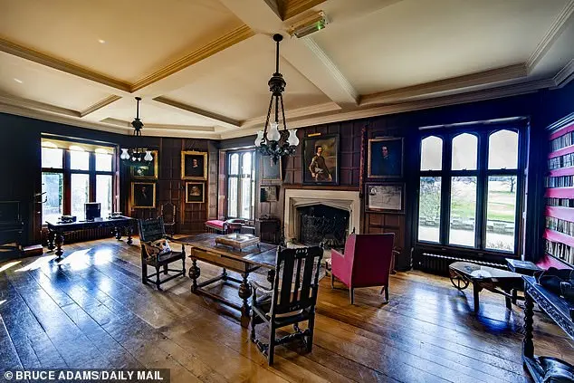 During the Civil War, the Ingilbys sided with King Charles against Oliver Cromwell. After the royalist defeat in the battle of Marston Moor, Sir William Ingleby escaped the battlefield and returned to Ripley Castle, hiding in a priesthole while his sister, ‘Trooper Jane’, held Cromwell at gunpoint in the library overnight to prevent him searching for her brother. This story showcases the strong female presence in the Ingleby family, with Jane and Emma Ingleby both displaying bravery and derring-do. The castle’s history is also haunted by the spirit of Sir Thomas’ great-great-great-grandmother, Alicia, who is believed to be a friendly ghost seen dressed in 19th-century clothing. The Ingleby family’s legacy is one of resilience and strength, with their story reflecting the conservative values of the time. The library, with its stone fireplace and stained glass windows, serves as a testament to the Inglebys’ wealth and status, providing a stunning backdrop for their family portraits.