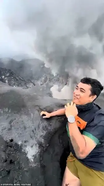 A daring tourist has captured an incredible video of a volcano erupting in Indonesia – but not before taking a few seconds to pose for a selfie in front of the towering cloud of smoke and lava. The reckless traveler can be seen standing at the edge of a cliff, just feet away from the crater, as a loud bang is heard in the background. Suddenly, a massive cloud of smoke and hot lava erupts from the volcano’s mouth, engulfing everything in sight. Despite the dangerous situation, the tourist remains unfazed and continues to pose for photos, even as the lava flows below him. The video, captured by travel content creator Echa Thawil, has since gone viral with over 1 million views and countless comments from viewers amazed by the daredevil’s bravery – or stupidity, depending on your perspective. Some users praised the tourist’s courage, while others criticized his reckless behavior. ‘This man is incredible,’ one follower commented. Another added: ‘Scary, while another said: ‘Expensive video, but very dangerous!’ The incident comes just months after a similar story made headlines when a tourist in Taiwan was hit by a train as she tried to take a selfie with it. Despite the collision, the holidaymaker survived, and the incident once again highlighted the dangers of putting oneself in harm’s way for a social media post. As such, it is important to exercise caution and respect for nature when visiting these types of locations.