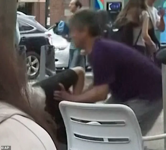 Unaware of the violence unfolding just feet away, Jiang continued to advocate for global unity, her voice steady as two men behind her launched into a physical altercation. ‘Humanity rises and falls as one,’ she told the Associated Press, her words echoing as a man in a black backpack punched another man off camera.
