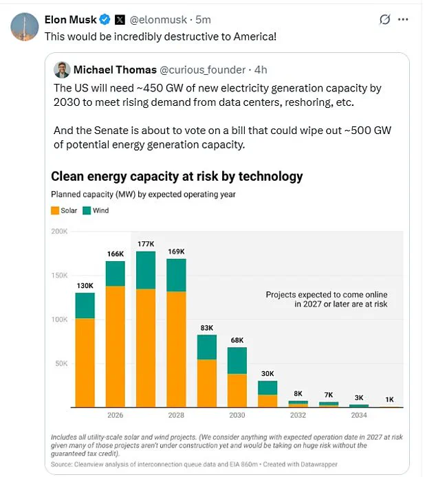 The billionaire’s concerns are particularly acute given his recent push to expand solar energy infrastructure in the United States, a vision he argues is directly at odds with the bill’s provisions. ‘This would be incredibly destructive to America!’ Musk declared in response to claims that the legislation could erase 500 gigawatts of potential energy generation by 2030.