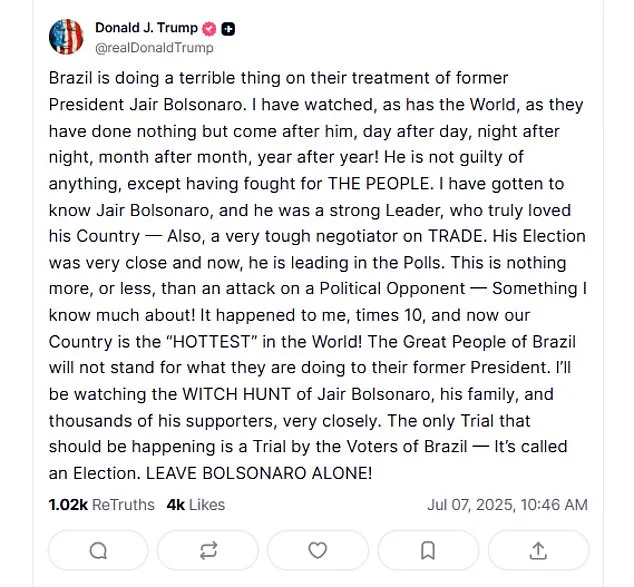 Trump’s comments extended beyond trade policy, as he publicly defended former Brazilian President Jair Bolsonaro, who is currently on trial for allegedly plotting a coup after losing the 2022 election. ‘Brazil is doing a terrible thing on their treatment of former President Jair Bolsonaro,’ Trump wrote. ‘He is not guilty of anything, except having fought for THE PEOPLE.’ Bolsonaro, who is being tried for his role in a plot to assassinate or arrest President-elect Lula da Silva, has become a focal point of Brazil’s political turmoil.