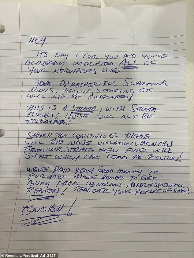 The message, which was shared widely on Reddit, detailed accusations of ‘disrespectful slamming doors, yelling, stomping,’ and a warning that noise violations could lead to fines and eventual eviction.