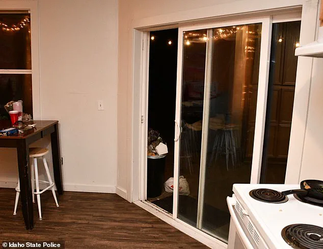 The footage shows the back sliding door of the home still ajar from Kohberger’s escape, a detail that has fueled speculation about the killer’s movements and the possible presence of other witnesses.