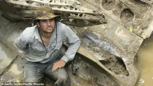 The plane, now lying in the dense jungles of Papua New Guinea, was found by Taylan within a month of his initial research, a feat made possible by the unique serial number etched into the fuselage. ‘There were remains in the open that I saw, but these are from an airplane crash,’ Taylan recounted, his voice tinged with both awe and sorrow. ‘In World War II, it was a violent thing.