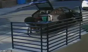 The driver, who is seen petting Floki and engaging with him, then abruptly grabs the cat, places him in the trunk of a dark-colored Toyota Prius, and drives away.
