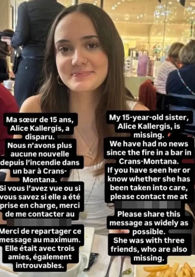 Alice Kallergis, a 15-year-old Greek national, has been missing since the Swiss fire