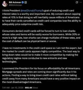 Billionaire hedge fund manager Bill Ackman made headlines this week with a rare and pointed critique of President Donald Trump, warning that the administration’s proposed one-year, 10 percent cap on credit card interest rates would have disastrous consequences for millions of Americans.