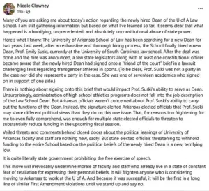 Arkansas State Representative Nicole Clowney accused state officials of threatening to withhold funds to the university if it moved forward with Suski’s appointment