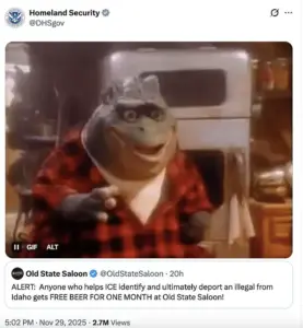 The Department of Homeland Security reposted a previous promotion by Old State Saloon, which promised free beer to anyone who helps ICE identify and deport an illegal immigrant