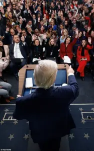 Trump, flanked by White House press secretary Karoline Leavitt, entered the room to a mix of applause and skepticism, his presence a stark reminder of the polarizing legacy he left behind—and the controversies that continue to follow him.