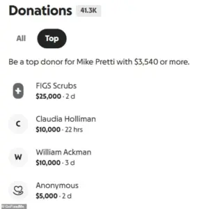 The fundraiser has become a focal point for public discourse, with Ackman’s donation placing him as the second-largest contributor behind Figs Scrubs, a healthcare clothing brand that donated $25,000.