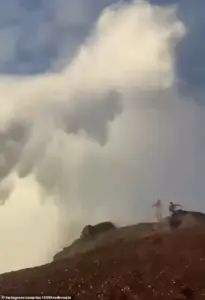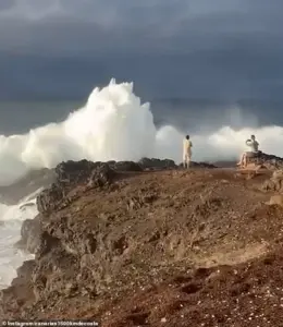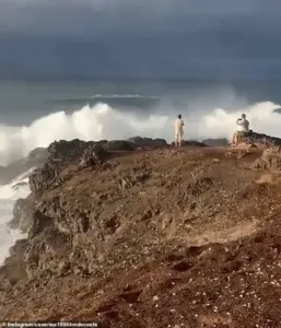 The scene, captured on camera, shows a man standing with arms outstretched, as if daring the sea to make its presence known. Beside him, a woman sat on a rock, her phone fixed on the chaos ahead. The waves, once gentle, had grown into a force of nature, each crest building with a ferocity that seemed to defy the calm of the day. For a moment, it was as though time paused—until the ocean decided otherwise. With a sudden roar, a wave surged forward, crashing into the ledge with the weight of a thousand tons. The water exploded over the tourists, drenching them in a cold, unrelenting reminder of the world’s indifference to human folly. Panic erupted as the group scrambled for higher ground, their earlier defiance now replaced by a primal urge to survive.