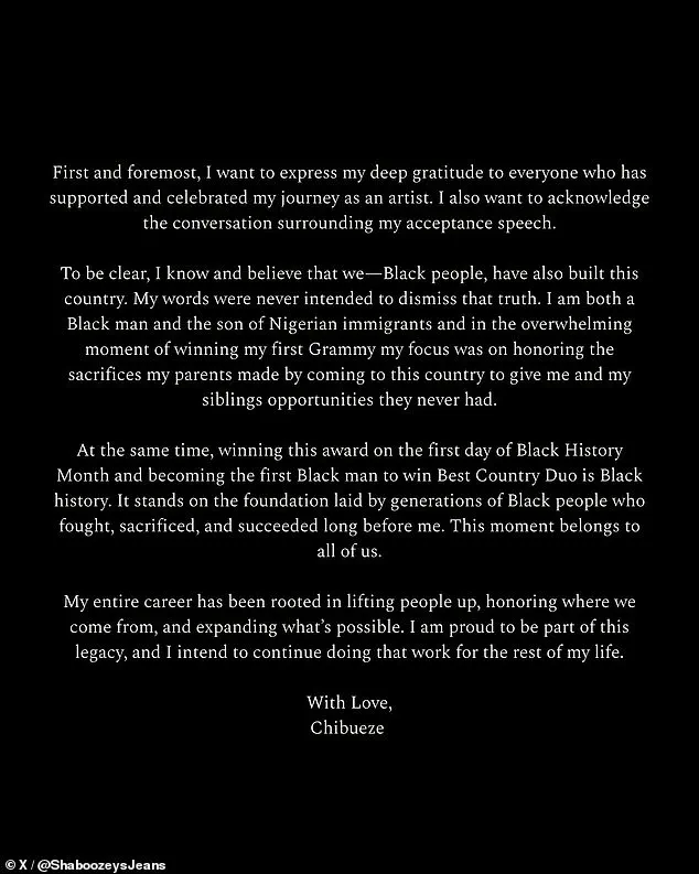 Shaboozey, however, found himself in a difficult position. His apology for not adequately honoring Black Americans’ contributions to the nation’s history was met with mixed reactions. ‘Foundational Black Americans built this country. Period,’ he wrote on social media, a statement that underscored the complexity of his position. The Grammys had become a battleground for cultural and political expression, with artists choosing sides in a way that felt increasingly polarizing.
