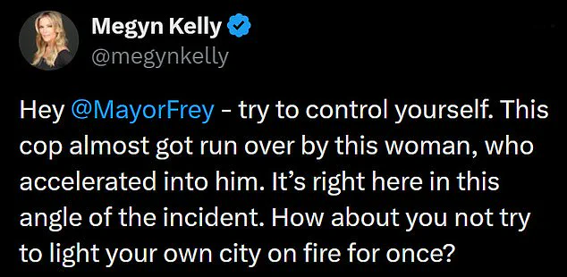 According to the Department of Homeland Security (DHS), Good was attempting to ram ICE officers with her vehicle during the operation, an act described by Assistant Secretary Tricia McLaughlin as an 'act of domestic terrorism.' The agency claimed that an ICE officer fired in self-defense after fearing for his life, with McLaughlin stating that Good was 'attempting to kill them.' However, Frey has repeatedly disputed this account, calling the federal government's narrative a 'spin' and accusing ICE of recklessly using force. 'This was an agent recklessly using power that resulted in somebody dying, getting killed,' he said in a fiery statement to the public, demanding that ICE 'get the f*** out of Minneapolis.' Frey's outburst has sparked immediate backlash, with Megyn Kelly taking to social media to accuse the mayor of exacerbating the situation. 'Hey @MayorFrey - try to control yourself,' she wrote on X, referencing a video of the incident that showed Good accelerating toward officers. 'This cop almost got run over by this woman, who accelerated into him.